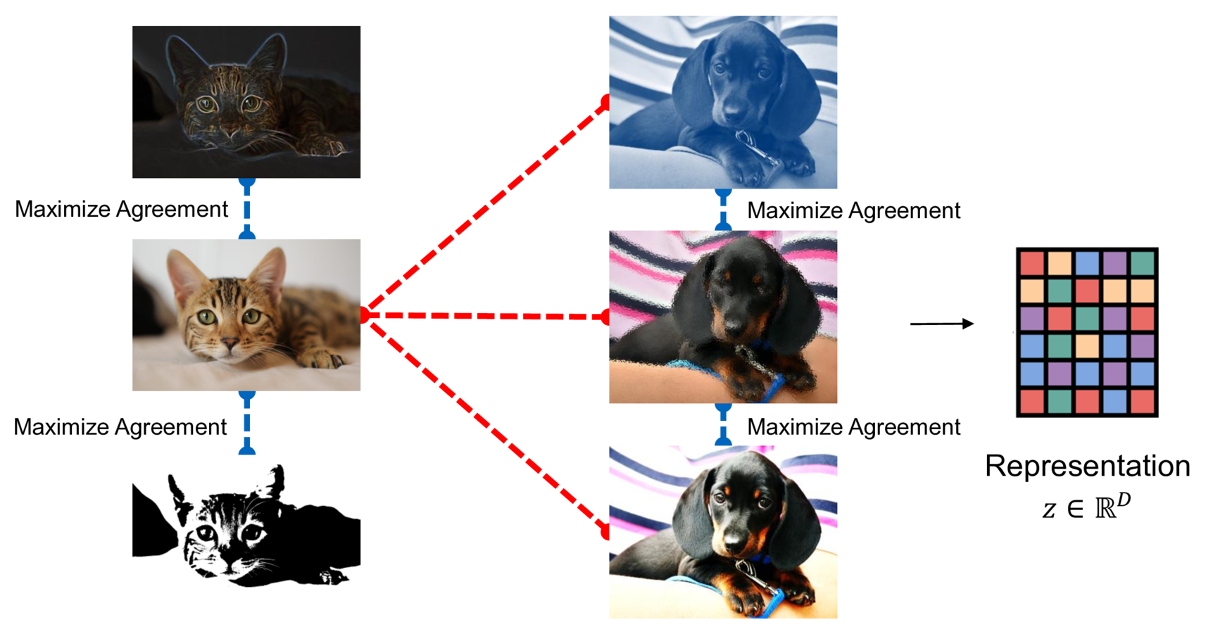 A simple example best explains the idea of contrastive learning. Consider pictures of cats and dogs, as seen in the figure above. We perform (minor) image augmentation techniques on the original pictures, such as changing the contrast or rotating and cropping the image. Although the pictures have been altered, the underlying semantic meaning does not change. All pictures of the cat are still pictures of the same cat, and all dog pictures still show the same dog. The idea behind contrastive learning is that augmentations of the same picture should have a similar representation. On the other hand, the difference in representation to all other images (such as pictures of dogs or other cats) should be as large as possible.